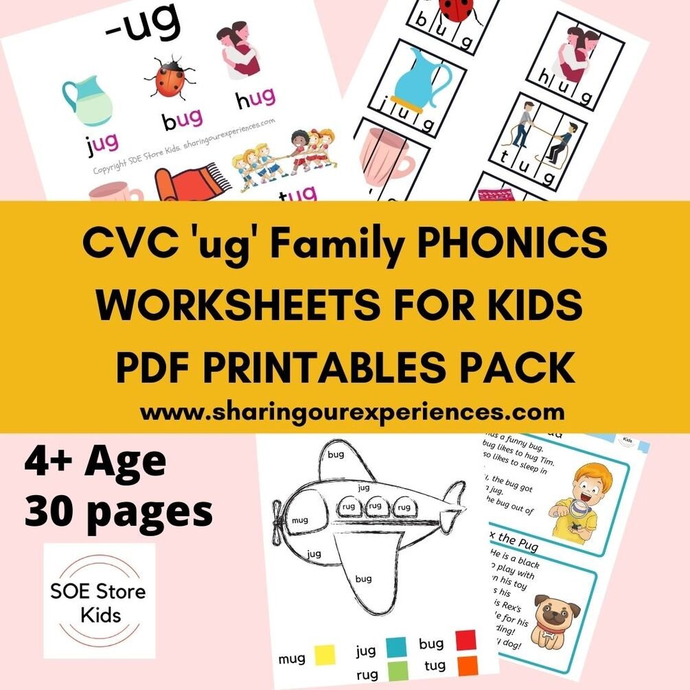 CVC "ug" word family printable Phonics worksheets for kids