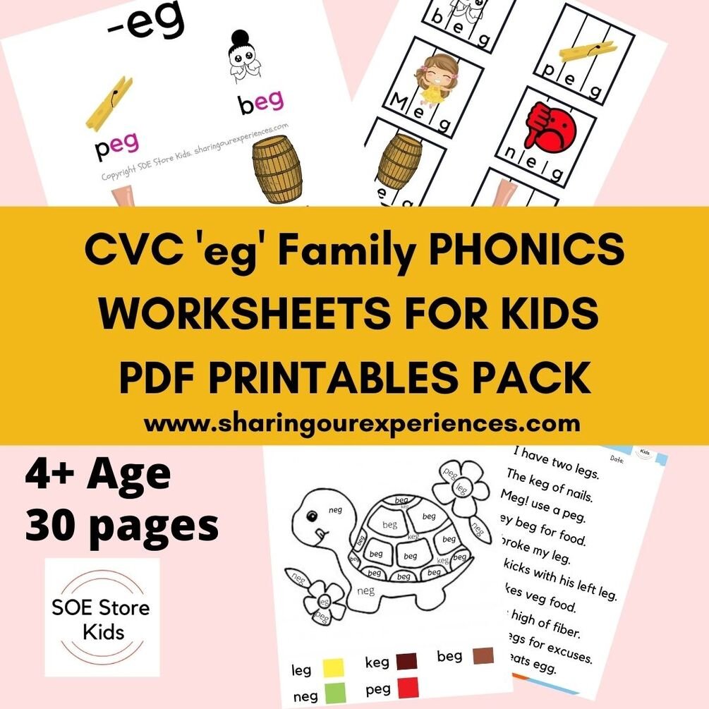 CVC "eg" word family printable Phonics worksheets for kids